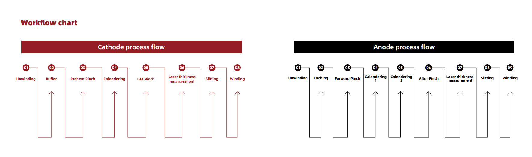 SS-SMARTECH Calendering and Slitting Machine is used in the manufacture of Li-ion battery electrodes. The coated cathode/anode electrode is rolled and evenly pressed to the required thickness by the continuous hydraulic roller device, and then slit into a number of battery electrodes of the required width and wound up neatly. After the battery electrode is coated and dried, the peeling strength between the active substance and the collector foil is very low, so it needs to be rolled to enhance the bonding strength between the active substance and the foil to prevent from peeling off in the process of electrolyte soaking and battery use. At the same time, the roll pressing of the battery electrodes can compress the cell volume, improve the energy density, reduce the porosity between the active substance, conductive agent, and binder inside the electrodes, reduce the resistance of the battery, and improve the battery performance.