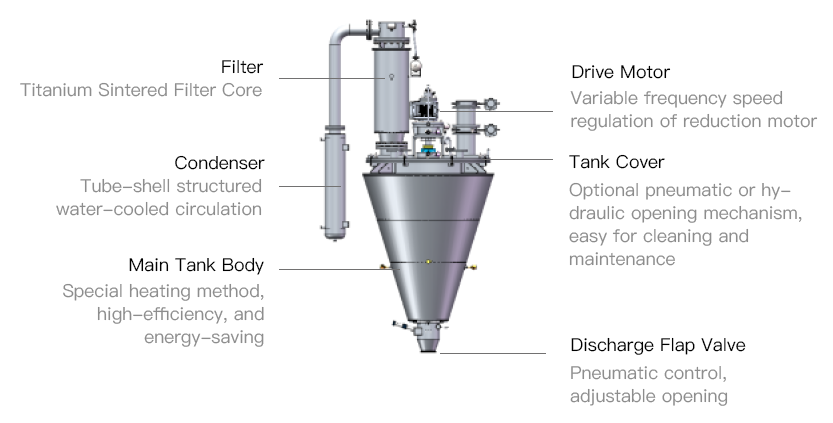 The unique heating method rapidly heats the cylinder wall while the internal helical ribbon rotates, turning the materials up and down, inside and outside. Moisture within the materials continuously evaporates, and under a vacuum environment, water vapor quickly escapes and is removed by the vacuum pump. If solvent recovery is needed, a condenser and recovery liquid storage tank can be added.