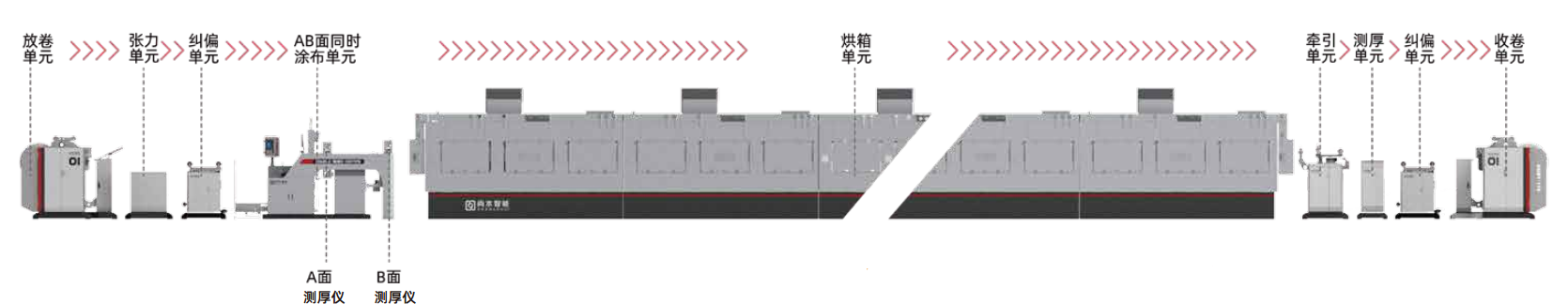 suncitygroup太阳新城双面同时挤压涂布系统主要用于电池正负极浆料在铜铝箔材两面的同时涂布,采用高精度预计量控制及狭缝模头技术,具备精度高、效率高、能耗低、产能大、智能化水平高等特点。
